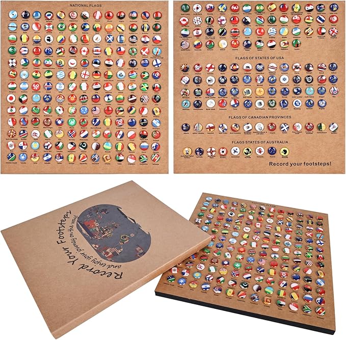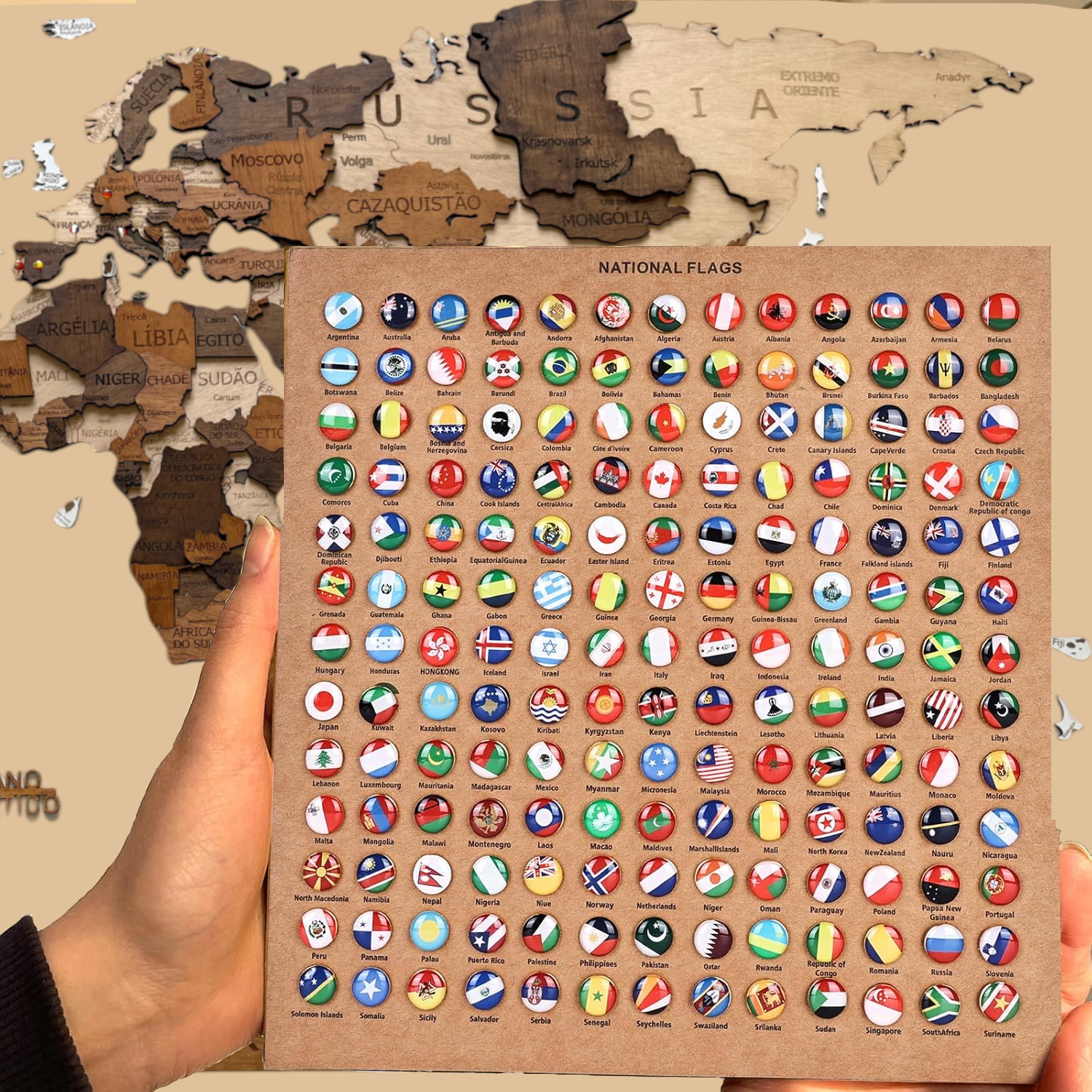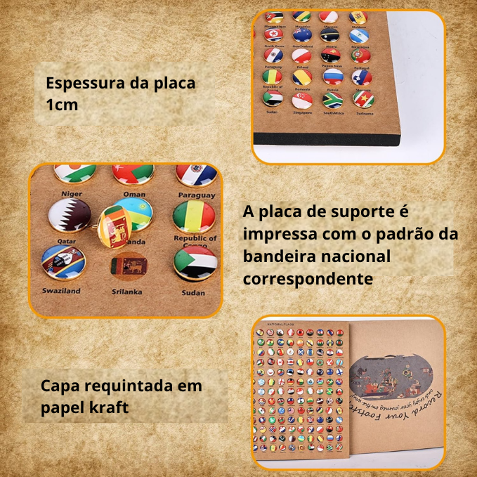 🎒 291 pins exclusivos: 195 bandeiras nacionais + 50 estados dos EUA + 10 províncias do Canadá + 6 estados da Austrália + 30 ilhas/regiões especiais.