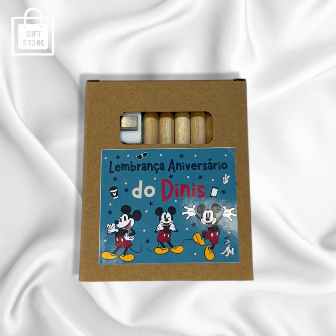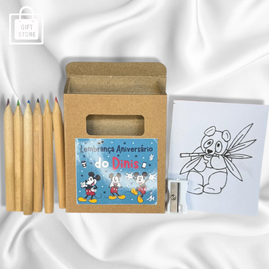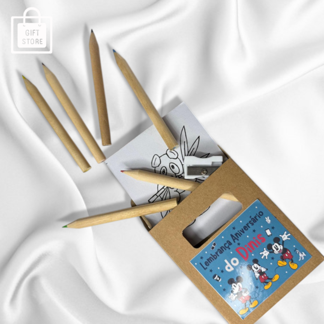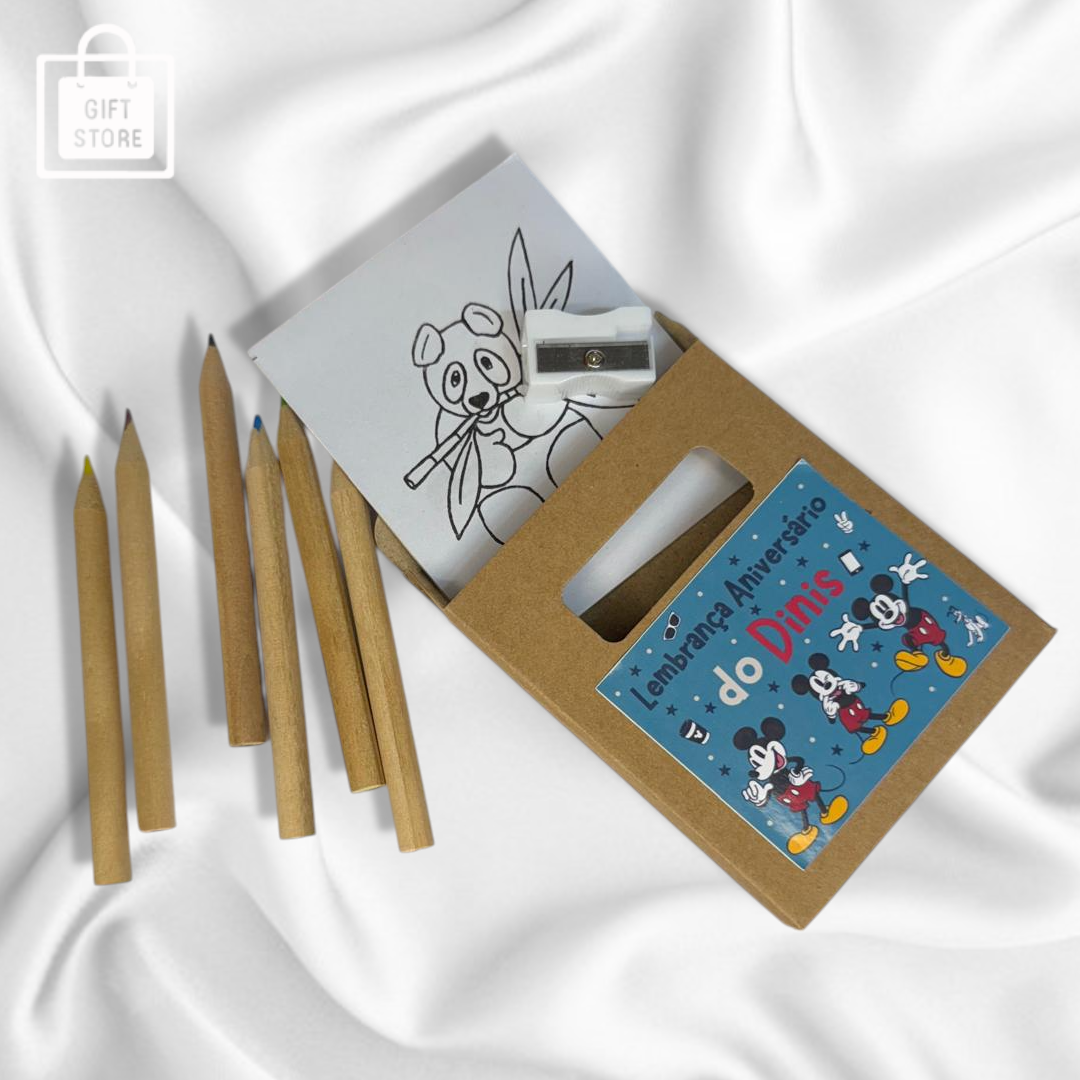Kit de lápis de cor com desenhos para pintar, ideal como lembrança de festa infantil. Personalizado com nome e tema à escolha!